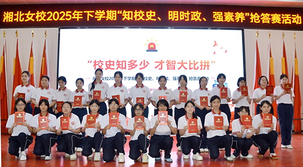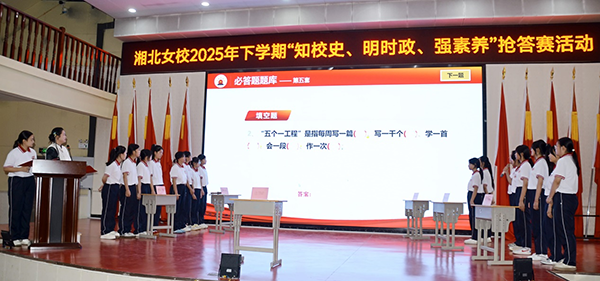 2025年9月22日下午,湘北女校在一、二年级学生中成功举办了一场别开生面的“知校史、明时政、强素养”主题知识抢答赛。此次活动旨在通过趣味化、竞技化的形式,深化校园文化建设,激发学生爱国爱校情怀,提升综合素养,引导女校学子主动学习传承校史、积极关注时代风云,自觉提升内在修养。